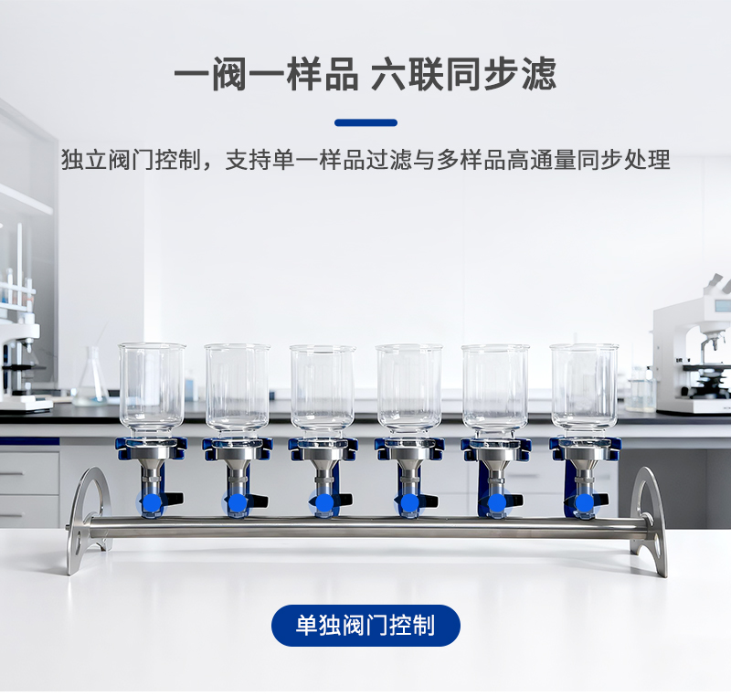 簡要描述: 每個樣品配單獨閥門控制,可單獨過濾一個樣品,亦可同時過濾六個樣品。